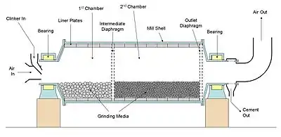 The mill is usually divided into at least two chambers (although this depends upon feed input size - mills including a roller press are mostly single-chambered), allowing the use of different sizes of grinding media. Large balls are used at the inlet, to crush clinker nodules (which can be over 25 mm in diameter). Ball diameter here is in the range 60–80 mm. In a two-chamber mill, the media in the second chamber are typically in the range 15–40 mm, although media down to 5 mm are sometimes encountered. As a general rule, the size of media has to match the size of material being ground: large media can't produce the ultra-fine particles required in the finished cement, but small media can't break large clinker particles. Mills with as many as four chambers, allowing a tight segregation of media sizes, were once used, but this is now becoming rare. Alternatives to multi-chamber mills are: