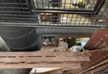 Inside the building is a cavernous space of steel beams, catwalks and staircases. Much of the piping from the plant's time in use remains visible, and the coal bunker suspended in the center is as well.[6] During the renovation in the late 1990s, four boilers in the lower levels were converted into restaurant space, the coal bunker was converted into an office, the west tower was opened to visitors and the east tower was converted into a conference room.[13]