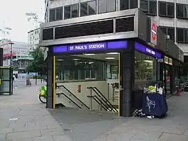 The Central London Railway (CLR) was given permission in 1891 for a tube line between Shepherd's Bush and a station at Cornhill, and the following year an extension to Liverpool Street was authorised, with a station at Bank instead of at Cornhill.[8] The line was built following the streets above rather than running underneath buildings, because purchase of wayleave under private properties would have been expensive,[lower-alpha 1] and as a result one line runs above another in places, with platforms at different levels at St Paul's, Chancery Lane and Notting Hill Gate stations.[9] The tunnels were bored with the nominal diameter of 11 feet 8+1⁄4 inches (3.562 m), increased on curves, reduced to 11 feet 6 inches (3.51 m) near to stations.[10] The tunnels generally rise approaching a station, to aid braking, and fall when leaving, to aid acceleration.[9]