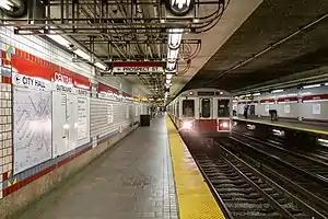 Kendall Square and Central Square stations had very similar designs, each with two side platforms 270–300 feet (82–91 m) long. The station had one exit and one entrance stairway at each end of each platform; all were 4 feet (1.2 m) wide except for one 6-foot (1.8 m)-wide pair.[8][9] The platforms and floors were made of granolithic. Station walls were tiled with white enamel, with a buff tile band 6 feet (1.8 m) above the floor and white plaster above.[8] Several original tile mosaics displaying the station name are still in place above the platforms.