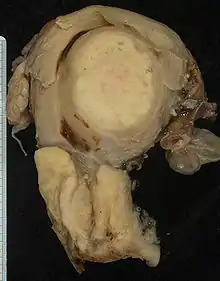 This large squamous carcinoma (bottom of picture) has obliterated the cervix and invaded the lower uterine segment. The uterus also has a round leiomyoma up higher.