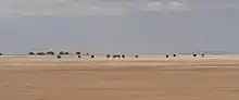 The high salinity makes the area home to only a few plant species. Most of the Chalbi Desert is barren and has no vegetation.[1] One of those areas where plants do grow is usually near outlets of tributary streams after the seasonal rainfalls. Salvadora persica, Acacia tortilis, and Cordia sinensis can grow in the areas around Chalbi's drainage system,[4][8] but most plants that grow in the desert are annual plants. One of those plants is Drakebrockmania somalensis.[8] During years of high rainfall, these areas can be seen covered by grasses like Aristida adscensionis and A. mutabilis.[4] Another region where some plants grow is in the former lake bed. There, one can find Lagenantha nogalensis. Finally, one can also find plants on the edges of the desert, such as Dasysphaera prostrata or Hyphaene coriacea.[8]