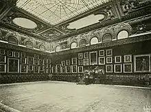 As designed, the main entrance to the upper levels opened into a large vestibule, which in turn led to a double-height hall measuring 20 by 80 feet (6.1 by 24.4 m). This hall was made of Caen stone and marble. The building's elevators, as well as a stair to the second-floor Great Hall, were placed at the end of this hall.[10][17][23] The design of the stair was inspired by the Ducal Palace in Venice and led to the second-story main room and elevator hall.[11][12] The decoration of the hall's upper half was extremely elaborate. Colored-marble Ionic columns supported a frieze, above which rose a domed ceiling. Between each set of columns, there were tablets that were inscribed with the names of the Chamber of Commerce's officers. At the time of the building's construction, the tablets accommodated names of past officers and could be inscribed with the names of future officers.[23] The rest of the ground floor was rented out as a banking room, the only commercial concern in the building.[10][9][18]