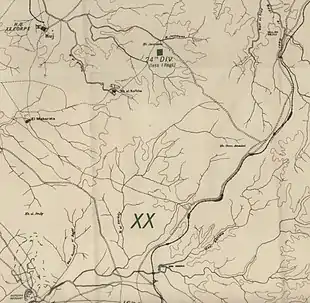 The 11th Light Horse Regiment had moved out to take up a line from Kh. Barata to the Wadi el Kerkerty by 10:00, with the 12th Light Horse Regiment on their right extending the line to the wadi Barata.[28] At 10:15 Chauvel ordered Hodgson to "move with centre on Kh Buteiha [3,000 yards (2,700 m) west, north-west of Tel esh Sheria] via G. 23 central [on the railway 1,000 yards (910 m) north of the wadi]."[41] Chauvel gave Hodgson "his exact line of advance,"[42] "a definite axis of advance and objective,",[33] "against a very hard section,"[42] "through defined squares on the map of operations, with his centre on a mud hut at Khurbet Buteihah, on the ridge behind the Turkish line of defences,"[34] but a delay allowed the Ottoman rearguard to strengthen the position before the charge began.[33] The direction of this advance had been laid down by the Egyptian Expeditionary Force General Staff in a letter written at 11:07 on 4 November. The orders for the "XXth Corps and Desert Mounted Corps" attacks on 6 November, included an advance "by the XXth Corps on the line Kh Buteihah - Sheria - Kh Kauwukah."[43] The two objectives of this advance were to push the enemy rearguard back from the 60th (London) Division, to give the infantry room to concentrate, and to enable the Australian Mounted Division to gain touch with the Anzac Mounted Division.[41]