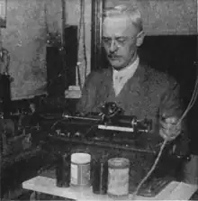 During the early days of the World War the incredibly rapid and undecipherable radio signals between the most powerful broadcasting station in Germany and the station of the "Telefunken Company" at Sayville, Long Island, N. Y., aroused the attention of the U. S. officials. But it was radio amateur, Charles E. Apgar of Westfield, N. J., who finally found the solution by means of amplifiers that recorded these signals on wax phonograph cylinders. By this means the messages were de-coded – and the Long Island station was promptly seized. This picture shows Mr. Apgar operating the same apparatus which he used on that historic occasion.[44]