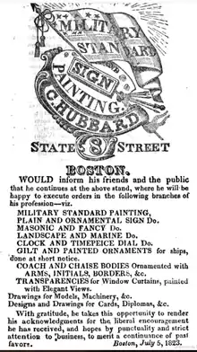 Hubbard trained with J.R. Penniman.[5] From 1822 to 1823 Hubbard formed a business partnership with ornamental and sign painters Samuel Curtis and B.B. Curtis as "Curtis's & Hubbard" (also known as "Curtises & Hubbard"). They produced a variety of painting, "in a plain and neat, or rich and ornamental style as may be requested," including "military standard, plain and ornamental sign, fancy, masonic, landscape, glass, clock and timepiece dial; designs and drawings for cards, diplomas, &c; transparencies ... for window curtains."[6][7] Clients included the Ancient and Honorable Artillery Company of Massachusetts;[8] the Chester Light Infantry of Chester, New Hampshire;[9] and the Haverhill Light Infantry Company of Haverhill, Massachusetts.[10]
