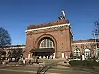Chattanooga grew with the entry of the United States in the First World War in 1917; the nearest training camp was in Fort Oglethorpe, Georgia. The Influenza pandemic of 1918 closed local movie theaters and pool halls.[23] By the 1930s, Chattanooga was known as the "Dynamo of Dixie", inspiring the 1941 Glenn Miller big-band swing song "Chattanooga Choo Choo".[24] Through Mayor P.R. Olgiati's efforts, Chattanooga became the first city in Tennessee to have a completed interstate highway system in the latter 1960s.[25][26][27] In February 1958, Chattanooga became one of the smallest cities in the country with three VHF television stations: WROM-TV (now WTVC-TV) channel 9 (ABC), WRGP-TV (now WRCB-TV) channel 3 (NBC), and WDEF-TV channel 12 (CBS).[28]