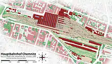 The station has a combination of terminating and through platforms. Platform tracks 5 to 9 terminate and tracks 1 to 4 and 10 to 14 continue to the west of Chemnitz towards Zwickau, Nuremberg and Göttingen. Tracks 11 to 14 are reached by a passenger subway. The subway also passes under tracks 15 and 16, which have no platforms. The platforms are also accessible by lift. From 15 December 2002 until 17 February 2013,[2] "Chemnitz model" tram-trains of the City-Bahn Chemnitz operated from platform 102 (a tram track) in the station forecourt. The tram-train services now use platforms 1 to 4.