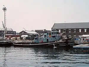 ![]() Chetek (YTB-827) tied up at Norfolk Naval Shipyard, Portsmouth, VA., 7 July 1988. Agawam (YTB-809) is astern of Chetek. | |