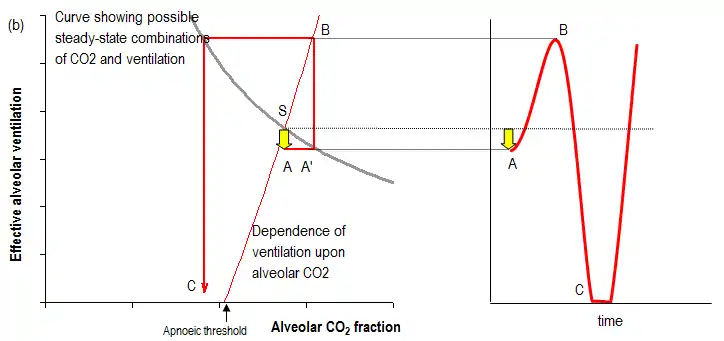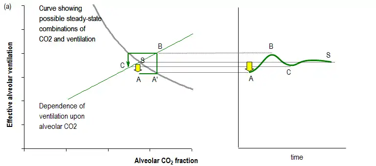 Through respiratory control reflexes, any small transient fall in ventilation (A) leads to a corresponding small rise (A') in alveolar CO2 concentration which is sensed by the respiratory control system so that there is a subsequent small compensatory rise in ventilation (B) above its steady state level (S) that helps restore CO2 back to its steady state value. In general, transient or persistent disturbances in ventilation, CO2 or oxygen levels can be counteracted by the respiratory control system in this way.