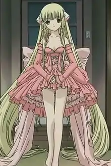 Reviews of Chi's character have been mostly positive. Nanase Ohkawa of Clamp stated: "We had a lot of letters with comments saying Chi was really cute" [2] THEM Anime Reviews critiqued Chi for being a main character but "not having a personality" in the series.[33] Tony Chen from Anime News Network said that "The way Clamp executes the development of Chi's character, growing her from what is basically the mental equivalent of a five-year-old child to a much more intelligent and complex being, is not only clever but also very cute."[34] On the website Screen Junkies, Chi is ranked number 3 of 10 of a "Top 10 anime girls" pick and number 6 of 10 for best anime couples (Chi and Hideki).[35][36] In his book The Anime Machine: A Media Theory of Animation, Thomas LaMarre describes Chi as "lighter than air" and a "slight slender undefined" body and with not much potential for physical movement. Thomas also describes Chi as "bony" and skeletal" in a physiological way and compares her to a curled up cat when reclining.[37] Chi is also a cosplayed character by fans at anime conventions and related events.[38]