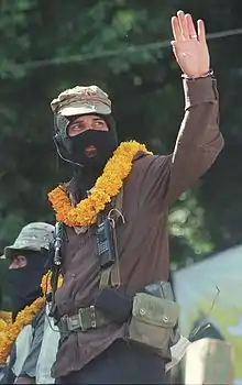 In 1982, General Absalon Castellanos Dominguez, then Governor of Chiapas, increased acts of violent oppression against indigenous people.[18] Members of the National Liberation Forces (FLN), including Rafael Vicente, eventually known as Subcomandante Marcos — the eventual spokesman of the EZLN[19] — moved into the area later that year, and by late 1983 the EZLN was formed by 3 indigenous people and 3 mestizos.[18] As the group grew, it became more like the state of Chiapas, consisting primarily of indigenous or partly indigenous people.[20]