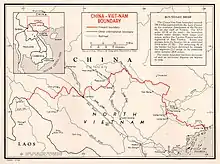 French Indochina was invaded by Japan via China during the Second World War, though a compromise was arranged whereby a Vichy French administration continued to run the colony whilst Japanese troops were allowed to be stationed there.[12][13] This modus vivendi broke down in the final year of the war – a short-lived Vietnamese puppet-state was established by the Japanese, which later collapsed, prompting the nationalist Việt Minh movement under Hồ Chí Minh to declare independence.[14] A long war then broke out as France attempted to reassert control, ending in their defeat and the independence of Vietnam; however the country was split in two, with North Vietnam like China now under Communist rule.[15] In 1957 and 1958 China and North Vietnam confirmed that they both respected the border established via the Tientsin Protocol.[16][17]
