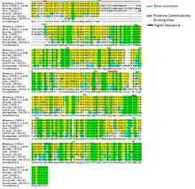 CHID1 shows a very high level of conservation. It has been identified in many model systems including Drosophila melanogaster, Caenorhabditis elegans, and Oryza sativa.[11] When conservation is observed over a large region, it becomes clear which protein domains are most important to CHID1. By far, the two best conserved factors are exon junctions you can add a link to exon junction, as well as several known carbohydrate binding sites. Another important region appears to be the last 15 amino acids, which retain a high level of conservation even through insect sequences.
