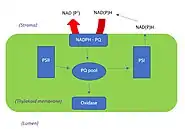 Initially, the presence of chlororespiration as a legitimate respiratory process in plants was heavily doubted. However, experimentation on Chlamydomonas reinhardtii, discovered Plastoquinone (PQ) to be a redox carrier.[2] The role of this redox carrier is to transport electrons from the NAD(P)H enzyme to oxygen molecules on the thylakoid membrane.[6] Using this cyclic electron chain around photosystem one (PS I), chlororespiration compensates for the lack of light. This cyclic pathway also allows electrons to re-enter the PQ pool through NAD(P)H enzyme activity and production, which is then used to supply ATP molecules (energy) to plant cells.[7]