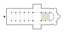 In a cathedral, the bishop's throne or cathedra is usually located in this space.[8]