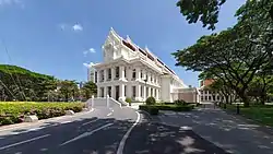 In 1917, the university had four faculties: Arts and Sciences, Public Administration, Engineering, and Medicine. The Faculty of Law was established in 1933 as part of the Faculty of Law and Political Science.[24] From the 1930s to the 1950s it expanded to various fields including Pharmacy (1934), Veterinary Science (1935), Architecture (1939), Dentistry (1940), and Commerce and Accountancy (1943). In 1943, the regency government under General Phibun separated the Faculty of Medicine, Dentistry, Pharmacy, and Veterinary Science to become the University of Medical Sciences, now Mahidol University. In 1948, the Faculty of Political Science was re-established. The Faculty of Education was established in 1957 from the School of Teacher Training at Baan Somdet Chao Phraya (Thai: โรงเรียนฝึกหัดครู บ้านสมเด็จเจ้าพระยา).[25] In 1967, the Faculty of Veterinary Science was returned from Kasetsart University and the Faculty of Medicine at Chulalongkorn Hospital was moved from University of Medical Sciences to Chulalongkorn University. In 1972, the Faculty of Dentistry and Faculty of Pharmacy were reinstated.
