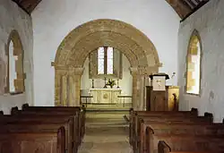 The interior includes a series of 14th century wall paintings,[2] including, in the Chancel, the Coronation of the Virgin, and several bishops and saints. On the north wall of the nave is a portrayal of the Death of the Virgin (pictured below right).[3][4] The murals were whitewashed during the Reformation and remained obscured until they were rediscovered in the 1860s.[5]