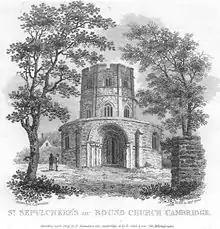 The church was built around 1130, its shape being inspired by the rotunda in the church of the Holy Sepulchre, Jerusalem. It was built by the Fraternity of the Holy Sepulchre, who were probably a group of Austin canons. It consisted of a round nave and an ambulatory, with a short chancel, probably in the shape of an apse.[4] Initially it was a wayfarers' chapel on the Roman road known as Via Devana (this is now Bridge Street).[5] By the middle of the 13th century it had become a parish church under the patronage of Barnwell Priory. Around this time structural alterations were made to the church, with the rebuilding of the chancel and the addition of a north aisle, the aisle being shorter than the chancel.[6] During the 15th century the Norman style windows in the nave were replaced by larger Gothic style windows. The carvings of angels in the roofs of the chancel and aisle were added. A polygonal bell-storey was built over the nave.[7] In 1643, during the Civil War, many of the "idolatrous" images were destroyed.[8] By the 19th century the church was in a poor state of repair. Part of the ambulatory collapsed in 1841, and the Cambridge Camden Society offered to carry out repairs. They appointed Anthony Salvin for the purpose.[9]