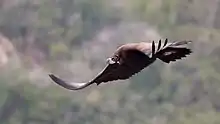 The cinereous vulture is distinctly dark, with the whole body being brown excepting the pale head in adults, which is covered in fine blackish down. This down is absent in the closely related lappet-faced vulture (Torgos tracheliotos).[5][6] The skin of the head and neck is bluish-gray and a paler whitish color above the eye. The adult has brown eyes, a purplish cere, a blue-gray bill and pale blue-gray legs.[5][6] The primary quills are often actually black.[6] From a distance, flying birds can easily appear all black. The immature plumage is sepia-brown above, with a much paler underside than in adults. Immature cinereous vultures have grey down on the head, a pale mauve cere and grey legs.[6] Its massive bill is one of the largest of any living accipiterid, a feature enhanced by the relatively small skull of the species. The exposed culmen of the cinereous vulture measures 8–9 cm (3.1–3.5 in).[15] Only their cousin, the lappet-faced vulture, with a bill length of up to about 10 cm (3.9 in), can rival or outsize the bill of the cinereous.[5] The wings, with serrated leading edges, are held straight or slightly arched in flight and are broad, sometimes referred to as "barn door wings". Its flight is slow and buoyant, with deep, heavy flaps when necessary. The combination of huge size and dark coloration renders the cinereous vulture relatively distinct, especially against smaller raptors such as eagles or buzzards. The most similar-shaped species, the lappet-faced vulture (with which there might be limited range overlap in the southern Middle East), is distinguished by its bare, pinkish head and contrasting plumage. On the lappet-face, the thighs and belly are whitish in adult birds against black to brownish over the remainder of the plumage. All potential Gyps vultures are distinguished by having paler, often streaky plumage, with bulging wing primaries giving them a less evenly broad-winged form.[5] Cinereous vultures are generally very silent, with a few querulous mewing, roaring or guttural cries solely between adults and their offspring at the nest site.[6]