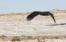 Like all vultures, the cinereous vulture eats mostly carrion. The cinereous vulture feeds on carrion of almost any type, from the largest mammals available to fish and reptiles.[22] In Tibet, commonly eaten carcasses can include both wild and domestic yaks (Bos mutus and Bos grunniens), Bharal, Tibetan gazelles (Pseudois nayaur), kiangs (Equus kiang), woolly hares (Lepus oiostolus), Himalayan marmots (Marmota himalayana), domestic sheep (Ovis aries), and even humans, mainly those at their celestial burial grounds.[17] Reportedly in Mongolia, Tarbagan marmots (Marmota sibirica) comprised the largest part of the diet, although that species is now endangered as it is preferred in the diet of local people, wild prey ranging from corsac fox (Vulpes corsac) to Argali (Ovis ammon) may be eaten additionally in Mongolia.[17][27] Historically, cinereous vultures in the Iberian Peninsula fed mostly on European rabbit (Oryctolagus cuniculus) carcasses, but since viral hemorrhagic pneumonia (VHP) devastated the once abundant rabbit population there, the vultures now rely on the carrion of domestic sheep, supplemented by pigs (Sus scrofa domesticus) and deer.[28] In Turkey, the dietary preferences were argali (Ovis ammon) (92 carrion items), wild boar (Sus scrofa) (53 items), chickens (Gallus gallus domesticus) (27 items), gray wolves (13 items) and red foxes (Vulpes vulpes) (13 items). Unusually, a large amount of plant material was found in pellets from Turkey, especially pine cones.[29] Among the vultures in its range, the cinereous is best equipped to tear open tough carcass skins thanks to its powerful bill. It can even break apart bones, such as ribs, to access the flesh of large animals. It is dominant over other scavengers in its range, even over other large vultures such as Gyps vultures, bearded vultures or fierce ground predators such as foxes.[6] While the noisy Gyps vultures squawk and fly around, the often silent cinereous vultures will keep them well at bay until they are satisfied and have had their own fill.[15][19] A series of photos taken recently show a cinereous vulture attacking a Himalayan griffon in flight for unknown reasons, although the griffon was not seriously injured.[30] Cinereous vultures frequently bully and dominate steppe eagles (Aquila nipalensis) when the two species are attracted to the same prey and carrion while wintering in Asia.[31] A rare successful act of kleptoparasitism on a cinereous vulture was filmed in Korea when a Steller's sea eagle (Haliaeetus pelagicus) stole food from the vulture.[32]