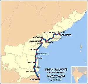 - ↑ "Circar Express/17643 Express Chennai Egmore". India Rail Info. 8 October 2011. Archived from the original on 19 October 2016. Retrieved 14 April 2012.