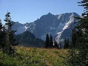 The history of the formation of the Cascade Mountains dates back millions of years ago to the late Eocene Epoch.[4] With the North American Plate overriding the Pacific Plate, episodes of volcanic igneous activity persisted.[4] In addition, small fragments of the oceanic and continental lithosphere called terranes created the North Cascades about 50 million years ago.[4] During the Pleistocene period dating back over two million years ago, glaciation advancing and retreating repeatedly scoured and shaped the landscape.[4] Glaciation was most prevalent approximately 18,000 years ago, and most valleys were ice-free by 12,000 years ago.[3] Uplift and faulting in combination with glaciation have been the dominant processes which have created the tall peaks and deep valleys of the North Cascades area.