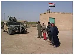 Iraqi farmers stand outside a rural school while a U.S. Army Civil Affairs team evaluates it for possible reconstruction funds (near Baghdad, April 2005).