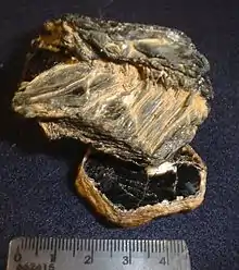 Crystal parting occurs when minerals break along planes of structural weakness due to external stress, along twin composition planes, or along planes of weakness due to the exsolution of another mineral. Parting breaks are very similar in appearance to cleavage, but the cause is different. Cleavage occurs because of design weakness while parting results from growth defects (deviations from the basic crystallographic design). Thus, cleavage will occur in all samples of a particular mineral, while parting is only found in samples with structural defects. Examples of parting include the octahedral parting of magnetite, the rhombohedral and basal parting in corundum,[3] and the basal parting in pyroxenes.[1]