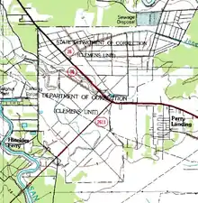 Clemens Unit (CN) is a prison farm of the Texas Department of Criminal Justice (TDCJ) in unincorporated Brazoria County, Texas,[1] in Greater Houston. The prison, with about 8,008 acres (3,241 ha), is located at the intersection of Farm to Market Road 2004 and Texas State Highway 36.[2] The prison, in the Texas Gulf Coast region,[3] is in proximity to the City of Brazoria,[4] and it is in proximity to the Velasco community, now a part of Freeport.[5] The prison is situated south of Houston.[3]