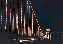 On 8 December 1864, the bridge was lit by a combination of four electric arc lamps, magnesium flares and limelights for its ceremonial opening ceremony.[36] This was the earliest use of external electric lighting in Bristol. However, the lighting levels were inconsistent and the magnesium lamps were blown out by the wind.[37] The custom of lighting the bridge has continued with more recent events, although later thousands of electric light bulbs were attached to the bridge instead of flares.[38]