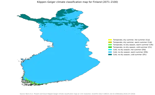 Climate change has far reaching impacts on the natural environment and people of Finland. Finland was among the top five greenhouse gas emitters in 2001, on a per capita basis.[1] Emissions increased to 58.8 million tonnes in 2016.[2] Finland needs to triple its current cuts to emissions in order to be carbon neutral by 2035.[3] Finland relies on coal and peat for its energy, but plans to phase out coal by 2029.[4] Finland has a target of carbon neutrality by the year 2035 without carbon credits. The policies include nature conservation, more investments in trains, changes in taxation and more sustainable wood burning.[5] After 2035 Finland will be carbon negative, meaning soaking more carbon than emitting.[6]