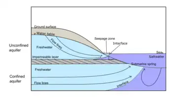 Regional groundwater flows can end up with confined aquifers in the coastal region and have an interface between seawater. |