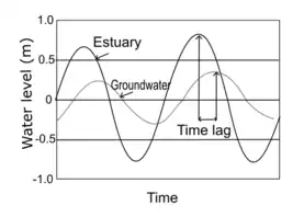 Periodic sea level changes by tides would cause a fluctuation in the groundwater level of a coastal aquifer system.[37] The tidal signal of sea tides becomes more attenuated and delayed with increasing distance to the land.[2] Water level fluctuations in the wells can be caused by the degree of connection between the ocean and the aquifer; groundwater flows well connected to the sea; alternating loading and unloading of the sea tide leads to plastic deformation.[38] Tidal efficiency of the magnitude of the oscillation of water level in a well to the oscillation of sea level is about 42% to 44%.[39] For example, if the magnitude of the oscillation of the sea level is 1 meter, the magnitude of the oscillation of water level will be 0.42 to 0.44 meter. However, the further away from the coast, the groundwater fluctuation would be lower.