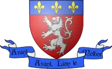 | Blazon | Gules a lion rampant Azure. Upon a chief of Azure three fleur-de-lys Or. |