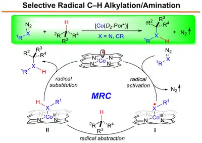 It is a compound in organic chemistry and free radical reactions that can involve homolysis. It is a one-electron catalytic approach for homolytic radical chemistry[1] based on structurally well-defined Co(II) complexes.[2] Due to their distinctive radical mechanisms that involve metal-stabilized radical intermediates, such as α-metalloalkyl radicals, α-metalloaminyl radicals, and α-metalloxyl radicals, the Co(II)–porphyrin-based catalysis system addresses some long-standing challenges in organic transformations.[3][4]