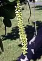 Sea grape is a dioecious species, that is, male and female flowers are borne on separate plants, and cross-pollination is necessary for fruit to develop. Honey bees and other insects help pollinate these plants;[6] male and female plants can be distinguished by the appearance of their flowers, as males usually show dead flower stalks.[7]