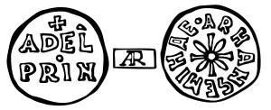 The first one[10] on the obverse presented in the field, on three lines, the legend + / ADEL' / PRIN and on the reverse a cross set aside by four lozenges, surrounded by the legend - ARHANGEMIHAE ("Archangel Michael"), very similar to the reverse of the deniers of Grimoald IV with the spike, part of the Lombard coinage of Benevento.[9][11][12] The title used was that of prince and the dedication was to the archangel Michael.