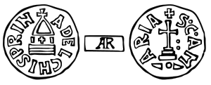 The third type[14] had in the field the letters P ADL R (Adelchi Princeps) arranged in three lines to form a cross, surrounded by the legend + SANCTA MARIA.[15]