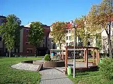 Apart from the Collegium Polonicum building itself, the Adam Mickiewicz University has built several student residences in Słubice. In October 1993, the first Polish Viadrina students could move into an inner city student dormitory called Amicus, which constituted the completion of the abandoned shell of a nurses' home. From 1994 onwards, a student residences campus was constructed on a post-military site according to a design by the Warsaw architectural office Pracownia Architektoniczna BNS Warszawa. In addition to seven residential buildings, the campus includes areas for a student club, amenities and sports activities. The first rooms were ready for occupancy in 1998, and the overall project was completed in 2003 with the handover of a residence for doctoral students and university staff. In total over 1,100 dormitory places were created, mainly in single and double rooms, plus 40 two- and three-room apartments for university members and about 40 temporary overnight accommodation places in single and double rooms.[12] The construction of the Collegium Polonicum and the student campus was financed to 65% from the budget of the Republic of Poland, to 20% from European funds under the PHARE programme and to 15% from the Foundation for German-Polish Cooperation.[13][14] In accordance to the joint concept of 1992 and the interministerial agreement of 2002, it is the Adam Mickiewicz University only that is the owner of the properties and obliged to cover maintenance and operational costs (see Article 6 of the Treaty[15]). In 2013, Adam Mickiewicz University began to reduce its real estate and building stock in Słubice. Apart from several undeveloped plots of land that had been set aside for extensions to the dormitory capacity and sports infrastructure, Adam Mickiewicz University sold the student residence Amicus to the municipality of Słubice, which set up 50 communal housing units there.[16] Since 2017, the building constructed as a residence for doctoral students (Dom Doktoranta) is offered for sale by the Adam Mickiewicz University as a residential building with a floor space of 1,951.4 m2, land area 3,530 m2.[17]