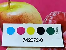 Food packaging printed in CMYK to faithfully reproduce the color of the pictured fruits. A process control patch from elsewhere on the same box helps ensure proper color reproduction.