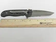 One of the company's most famous products is the M16 folding knife, which comes in a number of variations. The M16-13 Military, or M16-13M, is considered a very effective and rugged combat knife. It was developed by Harold "Kit" Carson, a former U.S. Army Sergeant Major. The M16-13M carries the special logo "1*" or "one asterisk," intended to invoke the phrase "one ass to risk." The M16 is equipped with a liner lock and an additional safety system to prevent inadvertent closing. Another notable M16 variation is the larger M16-14D, nicknamed the "Desert Big Dog." The M16-14T is a titanium framed version of the M16-14D.[3]