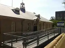 The only entry point into the penal settlement was via the adjacent wharf on the Brisbane River. Initially known as the King's Wharf or Jetty, it was constructed by 1827 when the boat crew's hut and boat builder's shed were first occupied. A crane was constructed on the end of the wharf in order to transfer goods from the arriving ships to the shore.[19] The main roadway into the settlement was up along the steep river bank following the present day alignment of Queens Wharf Road.[20] A pedestrian path developed along the slope from the wharf to the ridge of present-day William Street passing to the north-west of the Commissariat Store, through what is now Miller Park.[21] A retaining wall along the Queens Wharf Road frontage of Miller Park had been constructed by convicts before 1831. A wall, with an opening leading to stairs in a position corresponding to this path, appears in an 1838 plan.[22][23] A pencil sketch by Henry Boucher Bowerman dated c.1835 shows a wall here with an arched opening a few metres up the hill from the store yard wall.[24][1]