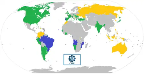 The Community of Portuguese Language Countries (Portuguese: Comunidade dos Países de Língua Portuguesa; abbr. : CPLP), also known as the Lusophone Community (Portuguese: Comunidade Lusófona),[1][2] is an international organization and political association of Lusophone nations across four continents, where Portuguese is an official language. The CPLP operates as a privileged, multilateral forum for the mutual cooperation of the governments, economies, non-governmental organizations, and peoples of the Lusofonia.[3] The CPLP consists of 9 member states and 33 associate observers, located in Europe, South America, Asia, Africa and Oceania, totaling 38 countries and 4 organizations.