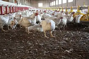 Livestock production has become increasingly dominated by CAFOs in the United States and other parts of the world.[6] Most poultry was raised in CAFOs starting in the 1950s, and most cattle and pigs by the 1970s and 1980s.[7] By the mid-2000s CAFOs dominated livestock and poultry production in the United States, and the scope of their market share is steadily increasing. In 1966, it took 1 million farms to house 57 million pigs; by 2001, it took only 80,000 farms to house the same number.[8][9]