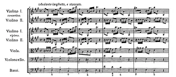 The first movement, marked larghetto affetuoso, has been described as one of Handel's finest movements, broad and solemn. The melody is played by the first violins in unison, their falling appoggiatura semiquavers reflecting the galant style. Beneath them, the bass part moves steadily in quavers, with extra harmony provided by the inner parts.