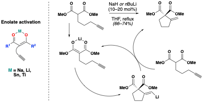 Enolate activation is the simplest Conia-ene activation mode. In this mode, the carbonyl starting material is treated with a strong base, such as nBuLi, NaH, or tBuOK, to form a metal-stabilized enolate, which then attacks the tethered alkyne and transfers the metal cation. An early example of enolate activation was reported by Taguchi and coworkers in 1999.[7] The authors found that in the presence of catalytic base, alkynyl-substituted malonate esters undergo facile cyclization to the corresponding cyclopentanes. High yields were also obtained with substituted cyanoacetate, sulfonylacetate, and phosphonoacetate analogs.