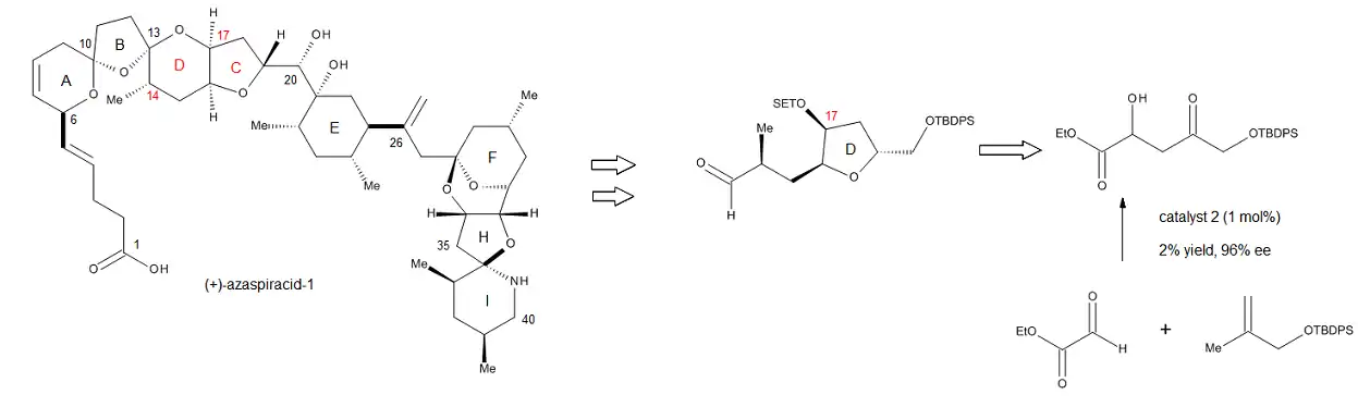 The synthetic utility of the chiral C2-symmetric Cu(II) catalysts was truly revealed in the formation of the C17 stereocenter of the CD ring fragment of (+)-azaspiracid-1, a very potent toxin (cytotoxic to mammalian cells) produced in minute quantities by multiple shellfish species including mussels, oysters, scallops, clams, and cockles.[20] As shown in Figure 19, the reaction that establishes the C17 stereocenter is catalyzed by 1 mol % Cu(II) complex 2 (Figure 15), and the authors note that it can be conducted on a 20 g scale and still give very good yields and excellent enantioselectivities. Furthermore, the product can be easily converted into the corresponding Weinreb amide, without any loss of selectivity, allowing for the facile introduction of the C14 methyl group. Thus, this novel catalytic enantioselective process developed by Evans and coworkers can be easily integrated into complex synthesis projects, particularly early on in the synthesis, when high yields and enantioselectivites are of utmost importance.