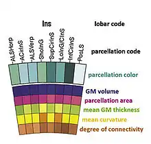 Connectograms are circular, with the left half depicting the left hemisphere and the right half depicting the right hemisphere. The hemispheres are further broken down into frontal lobe, insular cortex, limbic lobe, temporal lobe, parietal lobe, occipital lobe, subcortical structures, and cerebellum. At the bottom the brain stem is also represented between the two hemispheres. Within these lobes, each cortical area is labeled with an abbreviation and assigned its own color, which can be used to designate these same cortical regions in other figures, such as the parcellated brain surfaces in the adjacent image, so that the reader can find the corresponding cortical areas on a geometrically accurate surface and see exactly how disparate the connected regions may be. Inside the cortical surface ring, the concentric circles each represent different attributes of the corresponding cortical regions. In order from outermost to innermost, these metric rings represent the grey matter volume, surface area, cortical thickness, curvature, and degree of connectivity (the relative proportion of fibers initiating or terminating in the region compared to the whole brain). Inside these circles, lines connect regions that are found to be structurally connected. The relative density (number of fibers) of these connections is reflected in the opacity of the lines, so that one can easily compare various connections and their structural importance. The fractional anisotropy of each connection is reflected in its color.[1]