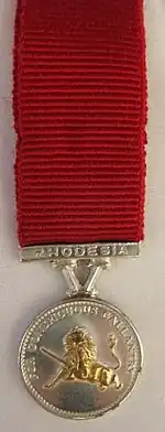 The medal was a sterling silver circular medal bearing the "wounded lion" device used by the British South Africa Police, highlighted with gold plate; suspended by a V-shaped suspender from a bar bearing the motto RHODESIA, suspended by a scarlet ribbon. Conspicuous Gallantry Decoration CGD The medal was impressed in small capitals with the recipient's name on the rim, and was awarded with a case of issue, miniature medal for wear, and an illuminated certificate.